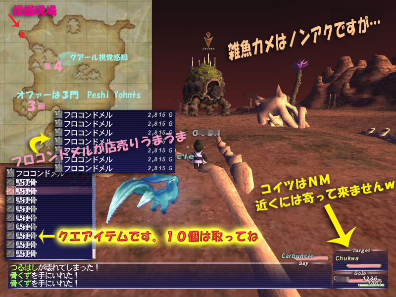ちょい追記です。 (今夜はアビセアつあーお休みです) アビセア-タロンギ名声上げ ① 星の木の実回収 ② オブストラクション ③ カーディアン点検 ④ 無へ誘う使者 ⑤ 職人魂 ⑥ 飢えに備えて ⑦ 道を切り開け! ⑧ 新種確保!? ⑨ 熱病の子を救って ⑩ そこにある絆 ⑪ 補給活動~タロンギ編 ⑫ 保守点検活動~タロンギ編 ジュノ上層 ①はみんなでしましたね ①の後は、⑪の補給活動を1回クリアしなければ ②に進めません。 ポイント:補給は1回でいいのでやっておこう ②はサングイニス×3個を渡すだけ(競売5-8000で売られている) ポイント:ミザレオのミュレクスが結構落とします。 (↑複数回可クエなので、これで上げ切ってもかまいませんが^^;) でっ、ここからがオカ的名声上げ ①>⑪>②と進んだ後(各1回) A:まず、カバンの空きを最低16以上(黒字を目指すなら最低21以上)開けてください B:ジュノ上層M&Pマートでつるはし5D(1本 200ギル)購入 C:下記マップ上で(4門から向いますが視覚感知のクァール注意) ほりほり ほりほり すてすて ほりほり 「堅硬骨」を最低10個は取ってください(~_~;) (要1石 30分くらい) つるはし5Dでやっと10個くらいの掘れ率です(笑) (競売でも1個8000-10000で売られている スタック不可) でっ D:⑤のクエを口から出たり入ったりして複数回オファー>クリア(要2分×10回) 丁度10個目のトレードが終わったら E:⑫の拡張タンククエが発生します。(同時に⑦も発生しますが・・・パスw) ポイント:つるはしは折れまくります。ただ採掘ものには店売りが 2800のが10個近くとれたりもしますので、黒字採算となります。 F:後は、拡張タンククエを3-4回すれば(4回推奨) G:⑨が発生 目標の ⑨「熱病の子を救って」x5回→だいじなもの:癒しの緑色ジェイド ③「カーディアン点検」→だいじなもの:恩賞の緑色ジェイド アビセアタロンギ卒業です<(_ _)> 追記: ⑨のクエがヴァナ18時~6時の間に、出たり入ったりでオファしないとなので その合間を縫って「飢えに備えて」「新種確保!?」が簡単なのでやっつけます。 すると③が発生! ⑨と③を並行してこなし、終了です<(_ _)> PR CommentsComment Form |